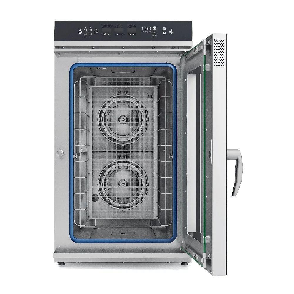 Габаритв: 550x801x995мм, 10500Вт, 220В, верхняя панель управления, парогенератор, 10хGN-2/3, память на 110 программ приготовления, термощуп, регулировка влажности, вся нерж, без г/емкостей, черный дизайн, реверс.