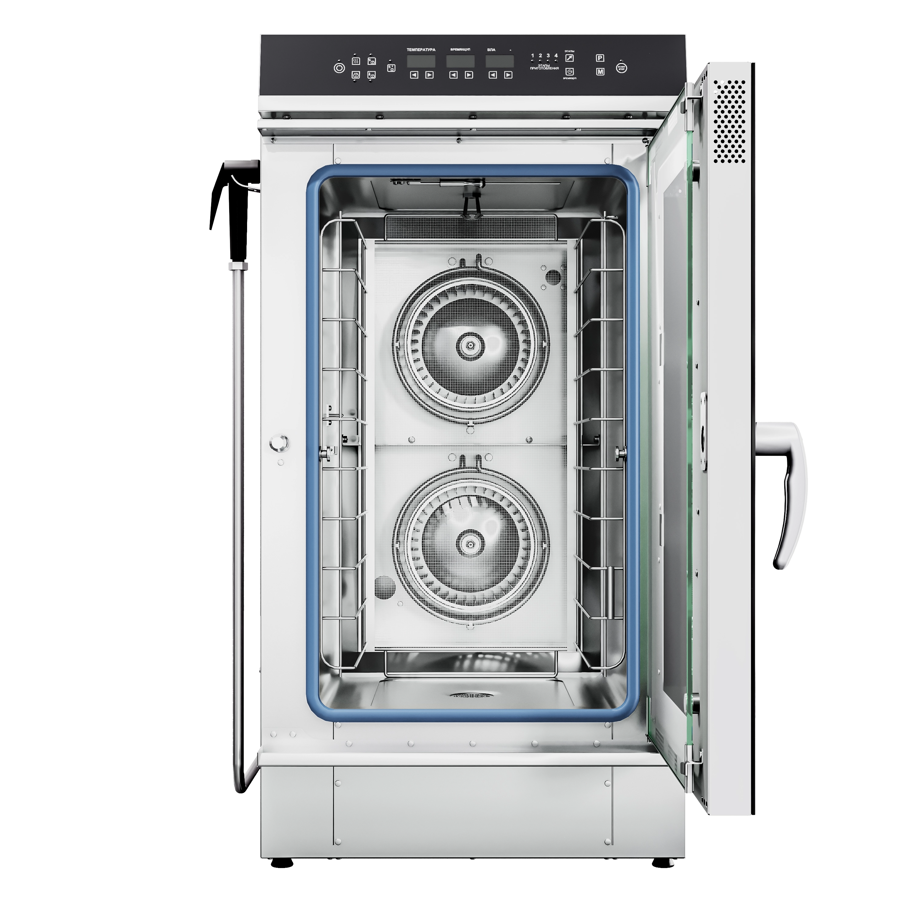 Габариты: 553x800x1095 мм, 10500Вт, 380В , верхняя панель управления (парогенератор, 10хGN-2/3, память на 110 программ приготовления, термощуп, регулировка влажности, автоматическая мойка, ручной душ в комплекте, вся нерж, без гастроемкостей) черный дизайн, реверс.
