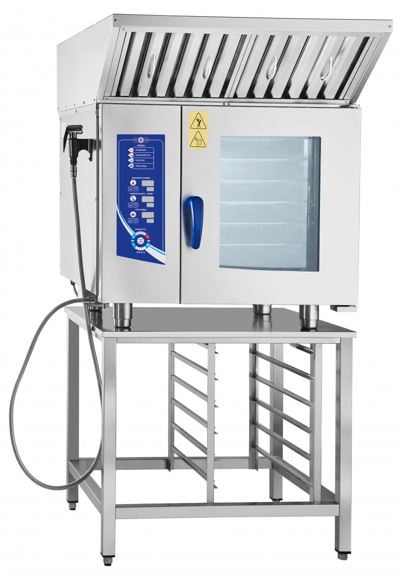 Габариты: 840х840(905)х775мм, 9500Вт, 380В, инжекционный, 6хGN-1/1, память на 110 программ приготовления, вся нерж, без г/емкостей, 3-х-канальный щуп, регулировка влажности, 5 скоростей вращения вентилятора