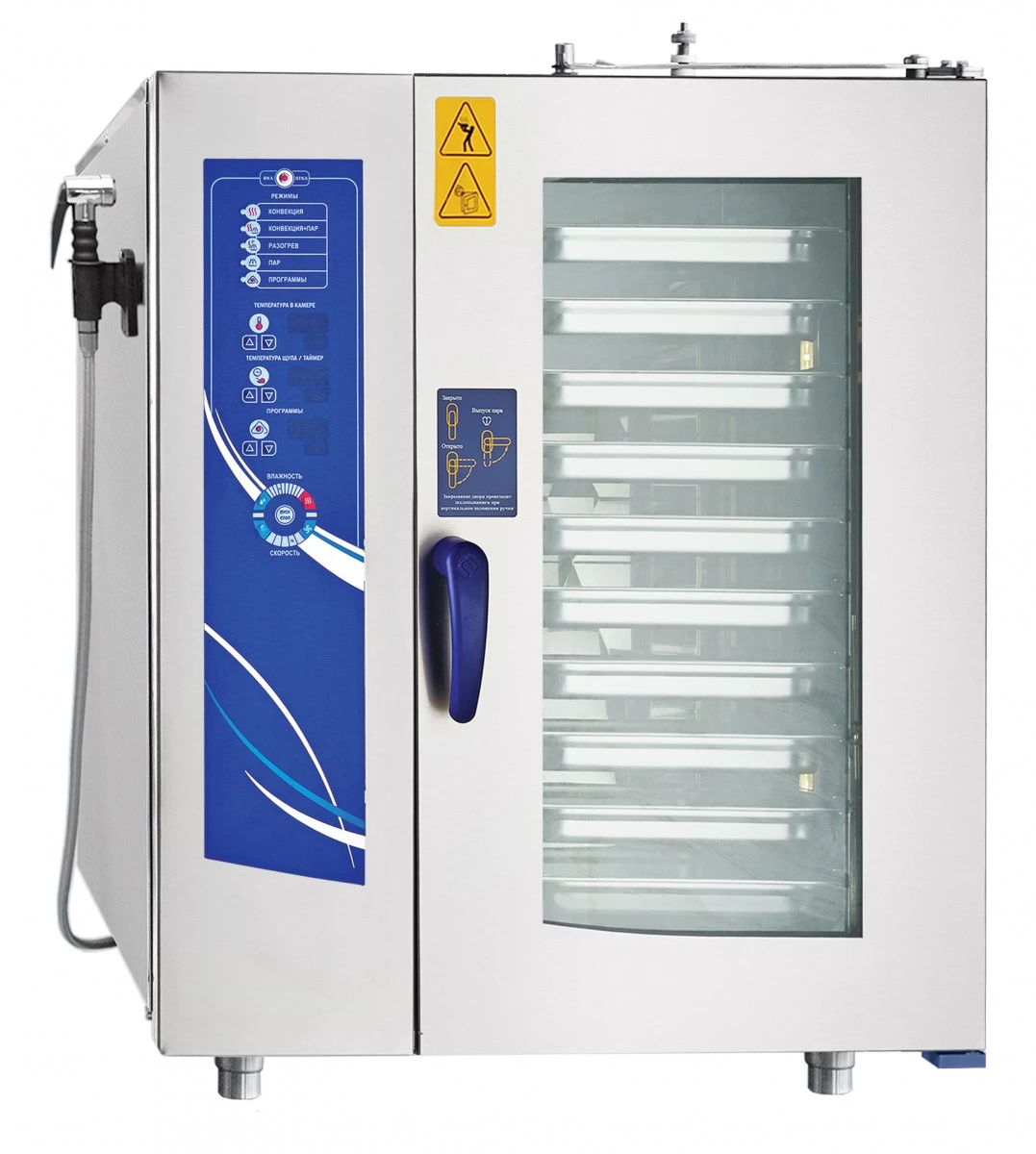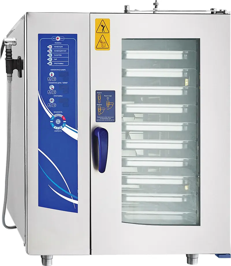 Габариты: 840х840(905)х1085 мм, 380В, 12500Вт, 270°C, морской, парогенератор, память на 110 программ приготовления, 10хGN-1/1, вся нерж, без г/емкостей, 3х-канальный щуп, регулировка влажности, вентилятор: + 5 скоростей, фиксация двери, крепление к полу.