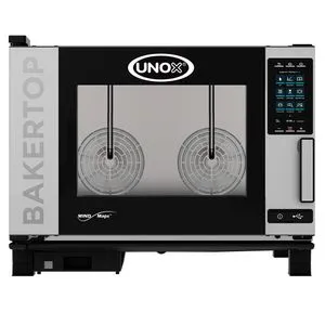 Пароконвектомат электрический инжекторный для выпечки и гастрономии с универсальными направляющими, серии BakerTop MIND.Maps Countertop, с функцией прямого пара (инжекторная), вместимость 4 противня 600х400мм или 4 противня gn 1/1, с сенсорным программируемым управлением Plus, подсветкой, четерыточечным щупом, 2 вентиляторами с автореверсом, автоматической системой мойки, правой дверью. 380V, WIFI, Мощность 10.6 кВт, габариты 860*967*675, габариты в упаковке 960*1110*840