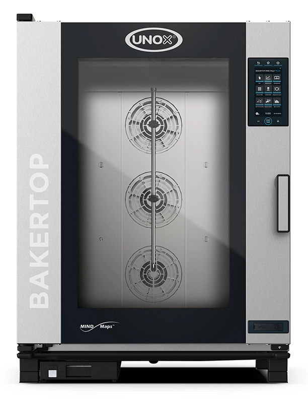 Пароконвектомат электрический инжекторный для выпечки и гастрономии с универсальными направляющими, серии BakerTop MIND.Maps Countertop, с функцией прямого пара (инжекторная), вместимость 10 противня 600х400мм или 10 противня gn 1/1, с сенсорным программируемым управлением Plus, подсветкой, четерыточечным щупом, 3 вентиляторами с автореверсом, автоматической системой мойки, правой дверью. 380V, WIFI, габариты 860*967*1163, мощность 21 кВт