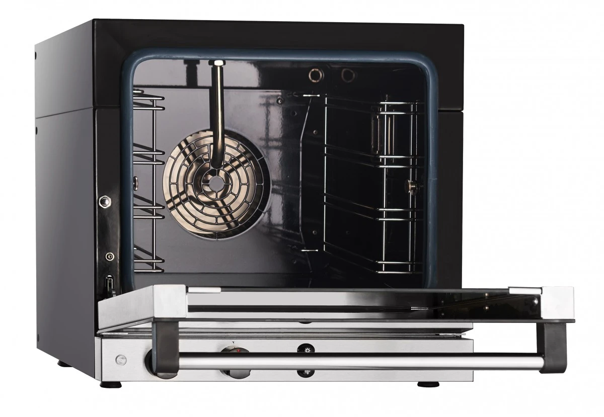 Габаритные размеры: 520х765х514мм, эл. мощность 3500Вт, напряжение 220В, 4 уровня, размер противня GN 1/2 (325х265 мм), эмалир. камера, эмалир. корпус, управление - эл/механика, пароувлажнение, реверс, без противней