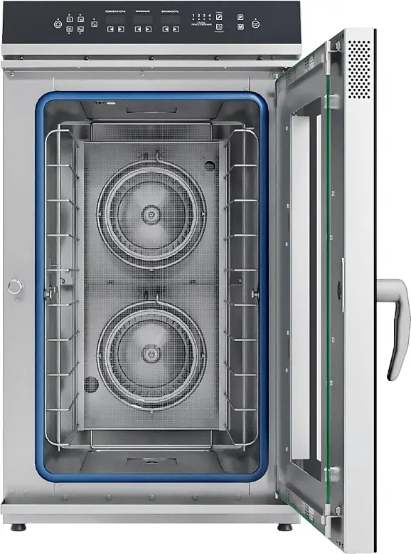 Габаритв: 550x801x995мм, 10500Вт, 220В, верхняя панель управления, парогенератор, 10хGN-2/3, память на 110 программ приготовления, термощуп, регулировка влажности, вся нерж, без г/емкостей, черный дизайн, реверс.