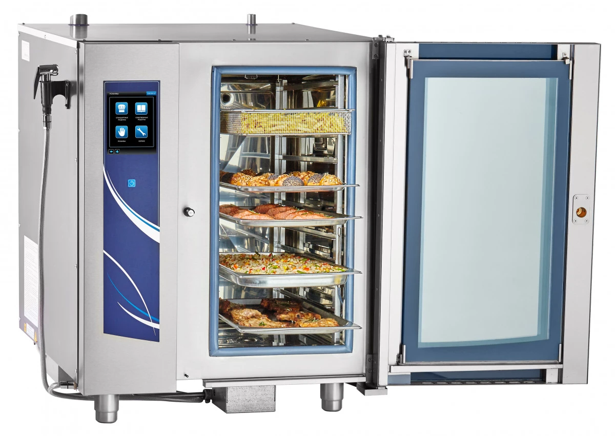 Габариты: 840x840(905)x1055 мм, 15500Вт, 380В. Парогенератор, 10хGN-1/1, 120 установленных + память на 360 доп. программ приготовления, автоматическая мойка, вся нерж, без г/емкостей, 3х-канальный щуп, ЖК экран, сенсорное управление, USB-порт