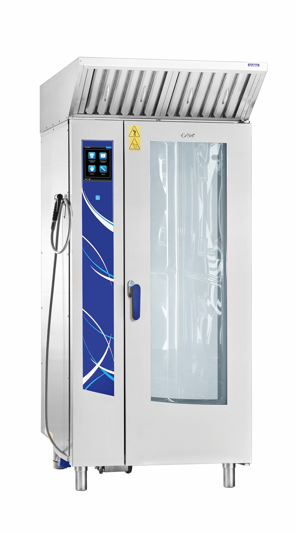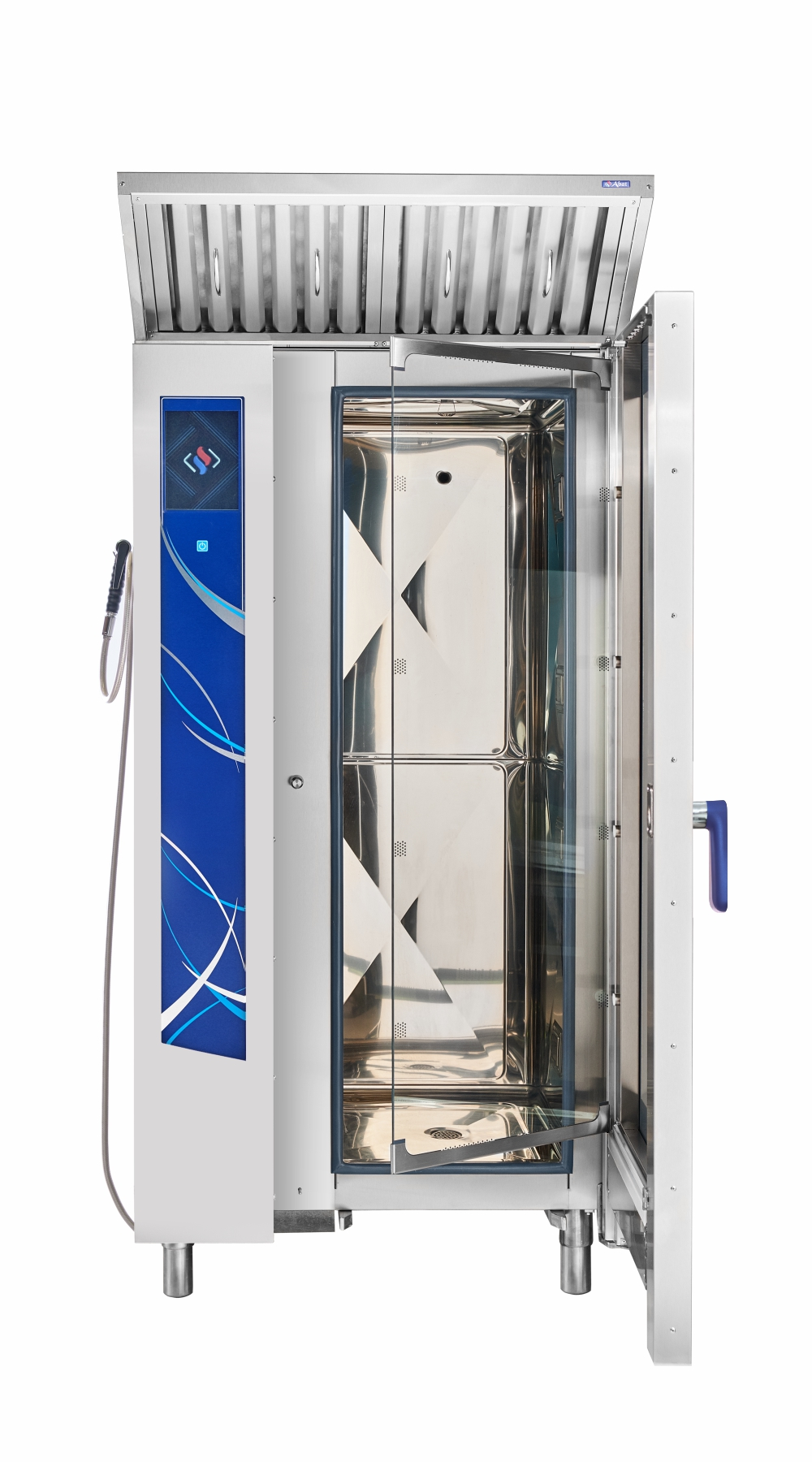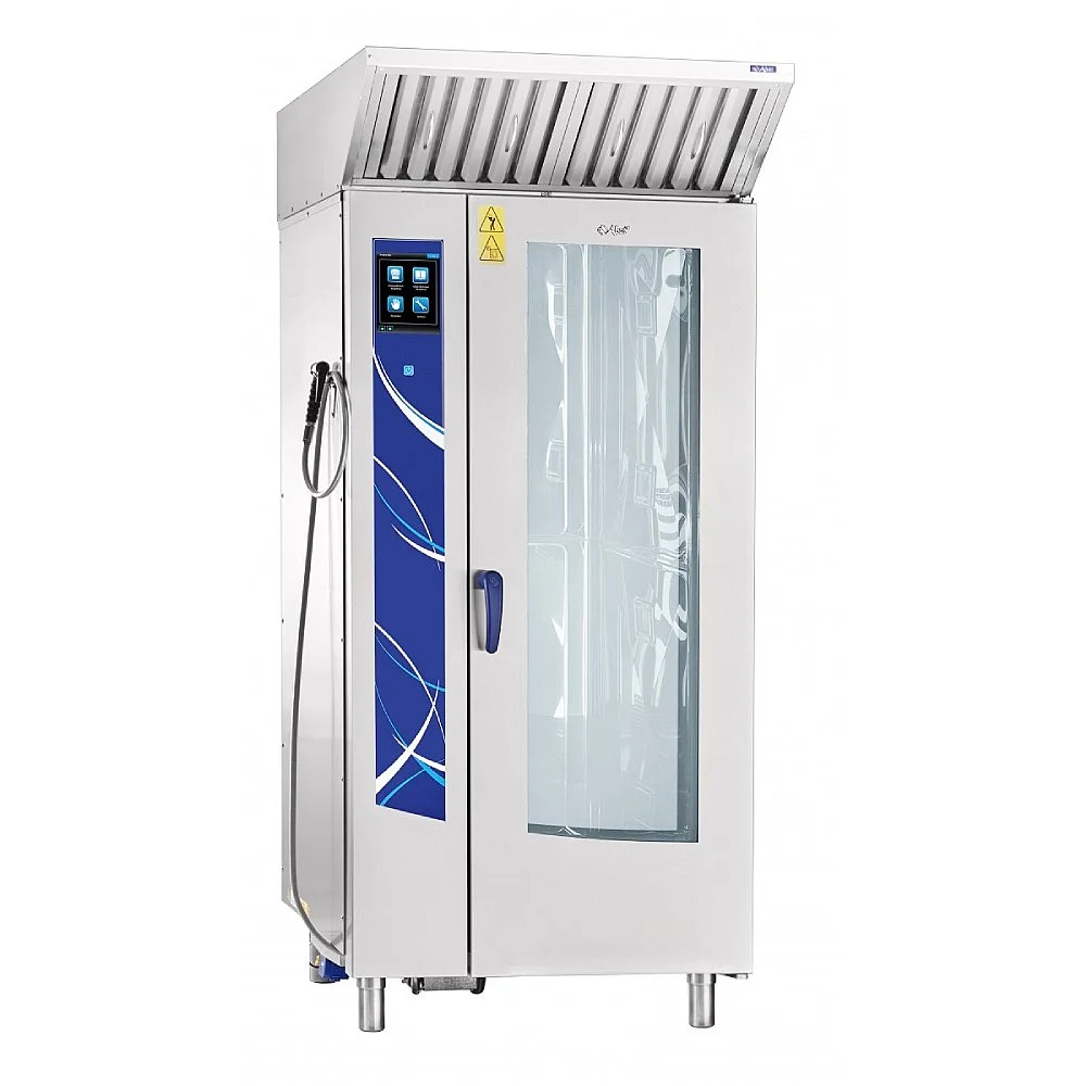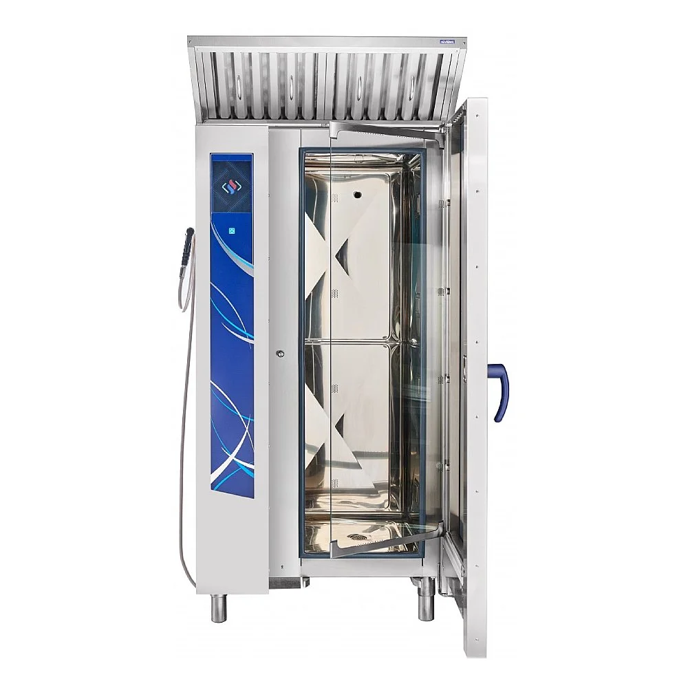 Габариты: 890x814(890)x1780 мм, 35000Вт, 380В, 20 уровней, без тележки, парогенератор, 120 установленных + память на 360 доп. программ приготовления, автоматическая мойка, вся нерж, без г/емкостей, 3х-канальный щуп, ЖК экран, сенсорное управление, USB-порт.
