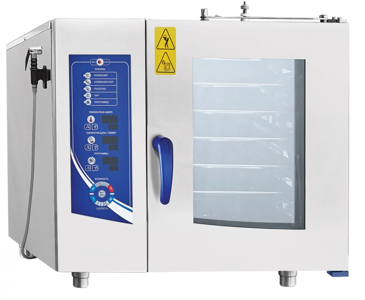 Габариты: 840х840(905)х805 мм, 9500 Вт, 380-220 В, морской, парогенератор, память на 110 программ приготовления, 6хGN-1/1, вся нерж, без г/емкостей, 3х-канальный щуп, регулировка влажности, вентилятор: + 5 скоростей, фиксация двери, крепление к полу