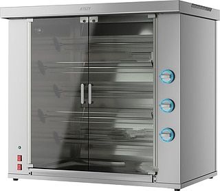 Гриль для кур ATESY Командор-2/5 газ используется на предприятиях общественного питания и торговли. Модель оснащена электродвигателем, 3 газовыми горелками, съемными шампурами и поддоном для сбора жира. Корпус и все внутренние элементы выполнены из пищевой нержавеющей стали, дверцы — из термостойкого ударопрочного стекла.