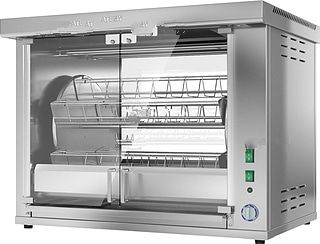 Гриль для кур ATESY Командор-6М используется на предприятиях общественного питания и торговли. Модель оснащена электродвигателем, терморегулятором, ТЭНами с отражателями тепла, съемными садками, внутренней подсветкой камеры и поддоном для сбора жира. Корпус и все внутренние элементы выполнены из пищевой нержавеющей стали, дверцы и задняя стенка — из термостойкого ударопрочного стекла с добавлением горного хрусталя, ручки дверей — из термостойкого пластика, и ножки — из пластмассы.