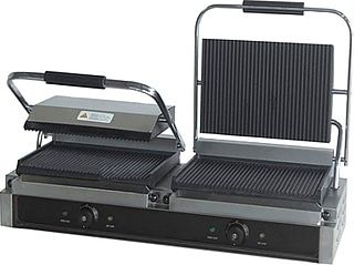 Прижимной гриль ROAL EG-813 предназначен для жарки мяса, рыбы, птицы, овощей, бутербродов и сэндвичей на предприятиях общественного питания и торговли. Модель оснащена 2 терморегуляторами, 2 индикаторами нагрева, жиросборником и предохранителем. Корпус выполнен из нержавеющей стали, жарочная поверхность имеет эмалированное покрытие.