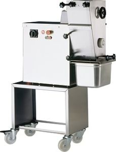 Ломтерезка Koneteollisuus Oy (KT) F-S19-9 используется на предприятиях пищевой промышленности и торговли для нарезки бескостного мяса на тонкие слои и ломтики, а так же для нарезки печени, филе домашней птицы, филе некоторых видов рыбы, плотных по консистенции овощей и фруктов. Модель оснащена емкостью для сбора обработанного продукта, температурным предохранителем, реле автоматического отключения двигателя и реверсивным переключателем. Корпус выполнен из нержавеющей стали.