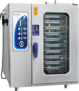 Подходит для готовки даже в открытом море. Пар образуется благодаря наличию парогенератора. Конструкция простая и надежная. Работа осуществляется при наличии мощности 12 кВт. Необходимое напряжение – 400 В. Наивысшая температура в камере составляет 270 градусов Цельсия. Внутри находится одна гастроемкость. ТЭНов – 3. Вес устройства – 135 килограммов. Имеется возможность поддержания установленной температуры. Допускается регулировка влажности. Вентилятор может работать с пятью разными скоростями. Мойка полуавтоматического типа. Парокновектомат способен функционировать даже в таких условиях, где за короткий промежуток времени температура может падать и подниматься несколько раз. Имеется 110 программ, которые существенно облегчают задачу приготовления той или иной продукции.