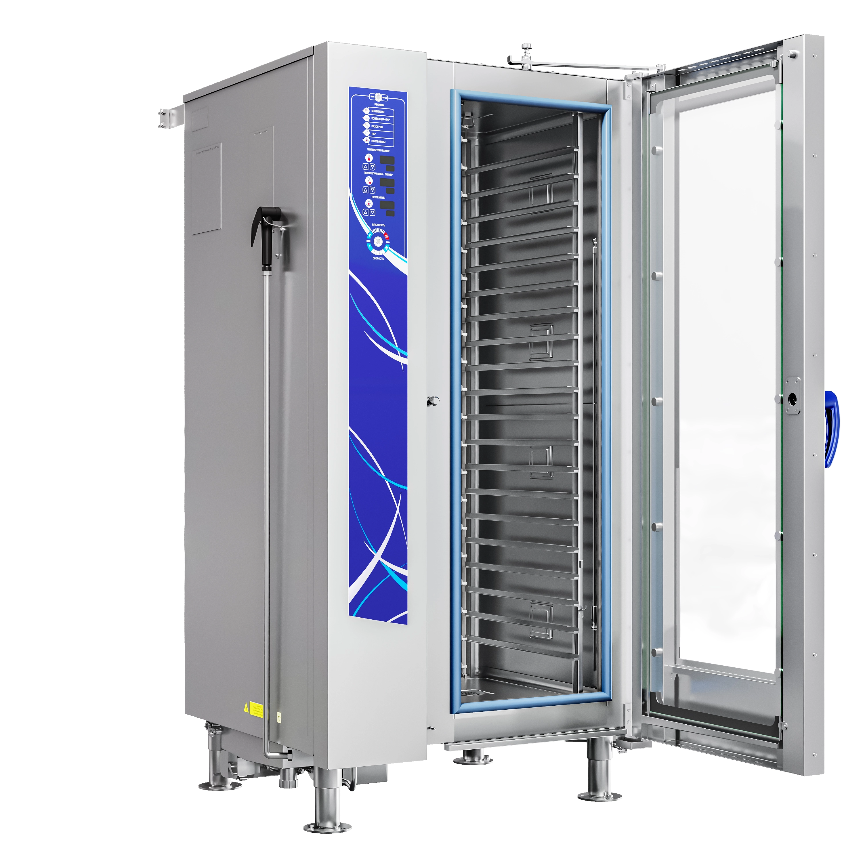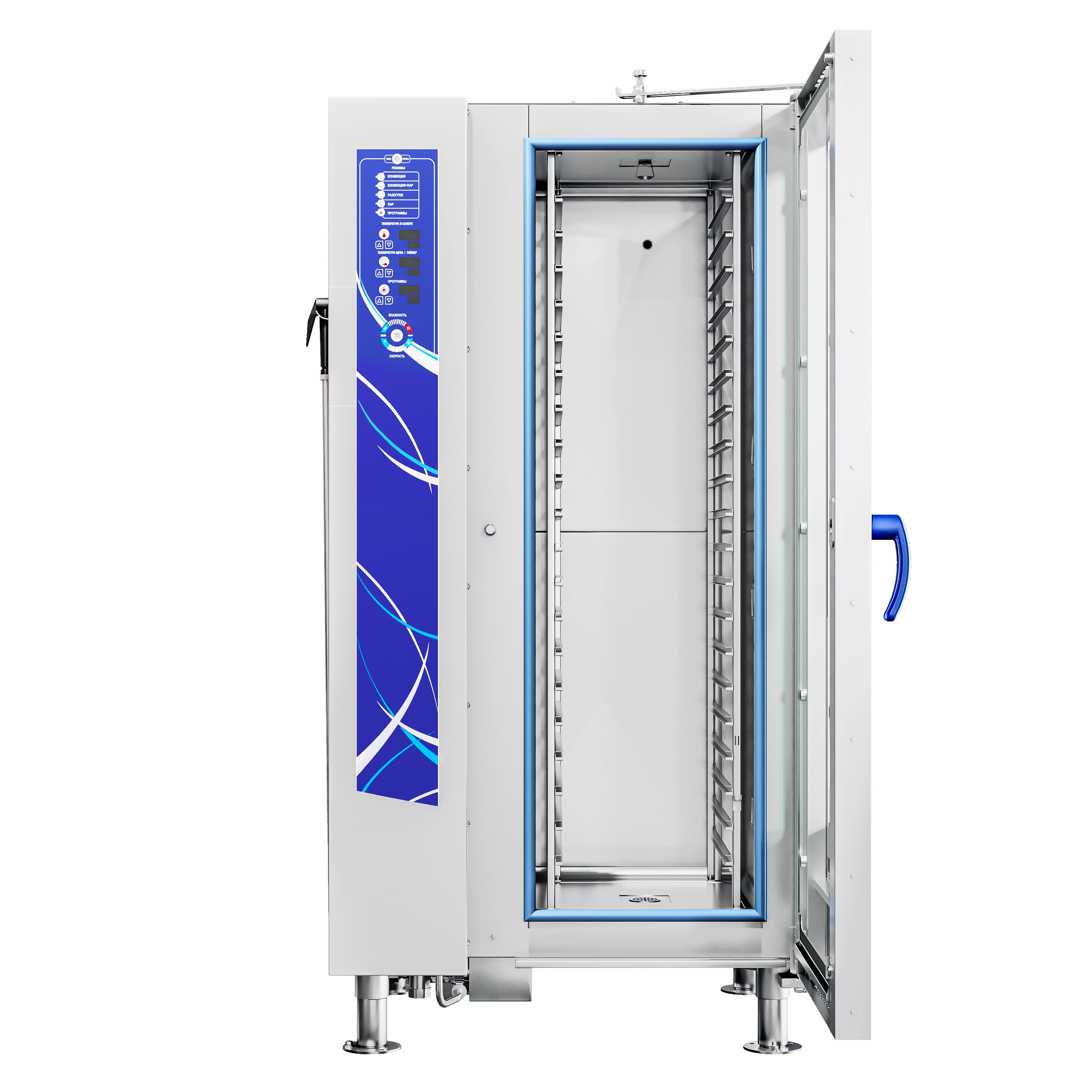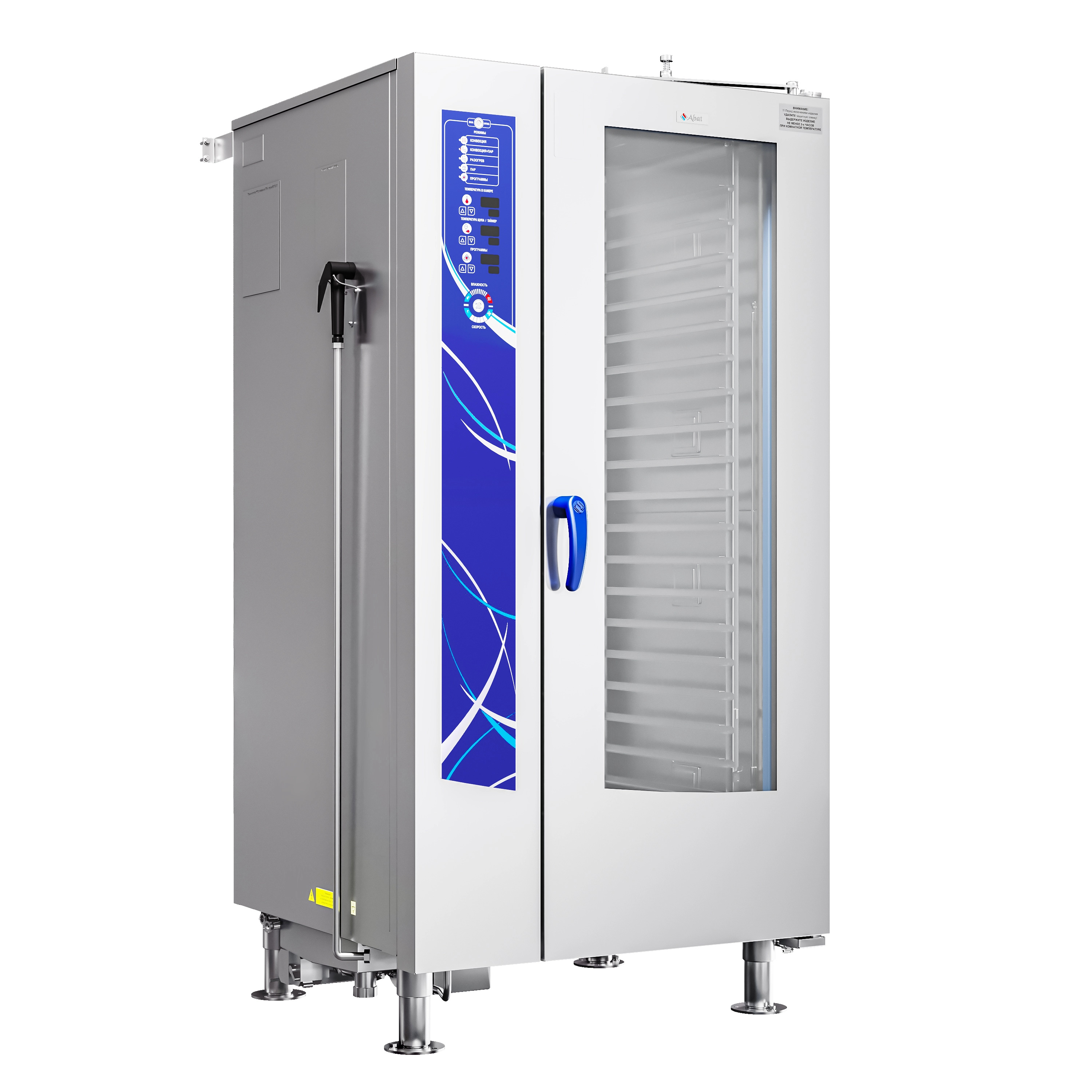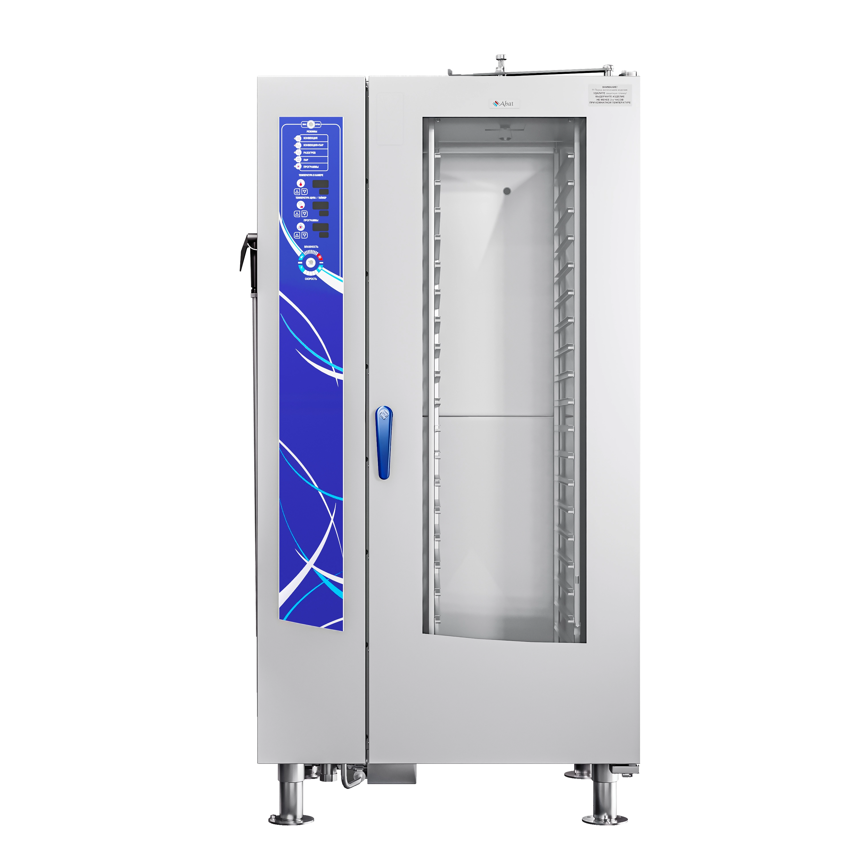 Пароконвектомат ПКА 20-1/1ПМФ2-01 (морской, парогенератор, тележка на 20хGN-1/1 в комплекте, память на 110 программ приготовления, 6 программ мойки, вся нерж, без г/емкостей, 3х-канальный щуп, регулировка влажности, вентилятор: реверс + 5 скоростей, фиксация двери, крепление к полу)