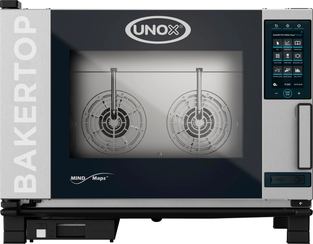 Пароконвектомат электрический инжекторный для выпечки и гастрономии с универсальными направляющими, серии BakerTop MIND.Maps Countertop, с функцией прямого пара (инжекторная), вместимость 4 противня 600х400мм или 4 противня gn 1/1, с сенсорным программируемым управлением Plus, подсветкой, четерыточечным щупом, 2 вентиляторами с автореверсом, автоматической системой мойки, правой дверью. 380V, WIFI, Мощность 10.6 кВт, габариты 860*967*675, габариты в упаковке 960*1110*840