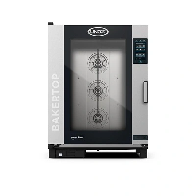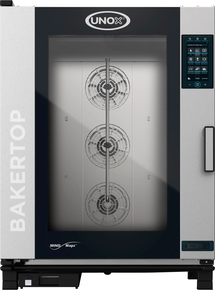 Пароконвектомат электрический инжекторный для выпечки и гастрономии с универсальными направляющими, серии BakerTop MIND.Maps Countertop, с функцией прямого пара (инжекторная), вместимость 10 противня 600х400мм или 10 противня gn 1/1, с сенсорным программируемым управлением Plus, подсветкой, четерыточечным щупом, 3 вентиляторами с автореверсом, автоматической системой мойки, правой дверью. 380V, WIFI, габариты 860*967*1163, мощность 21 кВт