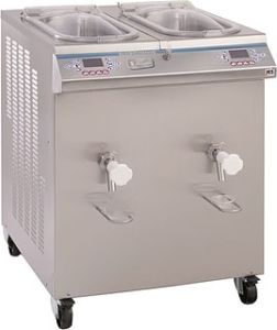 Пастеризатор Frigomat PEB 2×60 LCD EMU W используется на предприятиях общественного питания и торговли для приготовления мороженого, джелато, шербета, заварного крема, нуги, кондитерской массы и сиропов, а также для пастеризации смеси. Процесс пастеризации необходим для исключения развития в смеси микрофлоры, приводящей к пищевым отправлениям. Модель оснащена водяным охлаждением и 2 LCD-дисплеями, показывающим температуру в баке. Корпус цилиндра выполнен из нержавеющей стали.