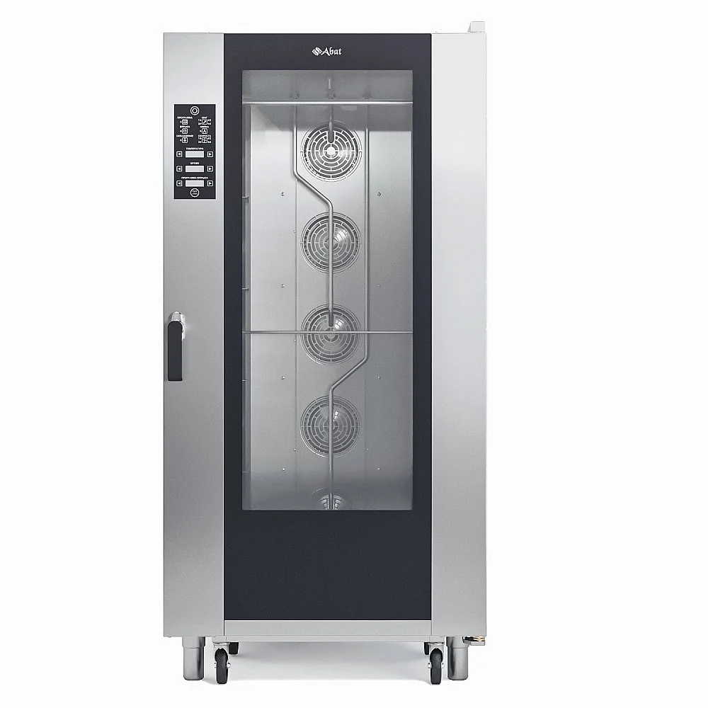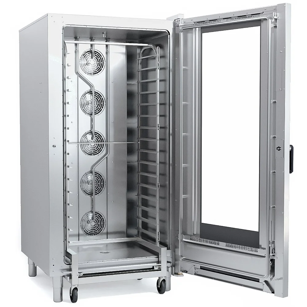 Габаритные размеры: 885х1080х1825мм, напряжение 380В, эл. мощность 24700Вт, подкатная тележка на 16 уровней для противней 400х600 мм, без противней
