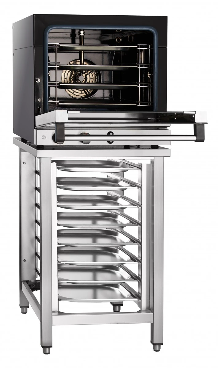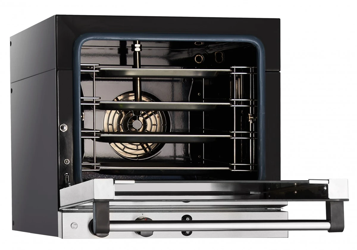 Габаритные размеры: 520х765х514мм, эл. мощность 3500Вт, напряжение 220В, 4 уровня, размер противня GN 1/2 (325х265 мм), эмалир. камера, эмалир. корпус, управление - эл/механика, пароувлажнение, реверс, без противней