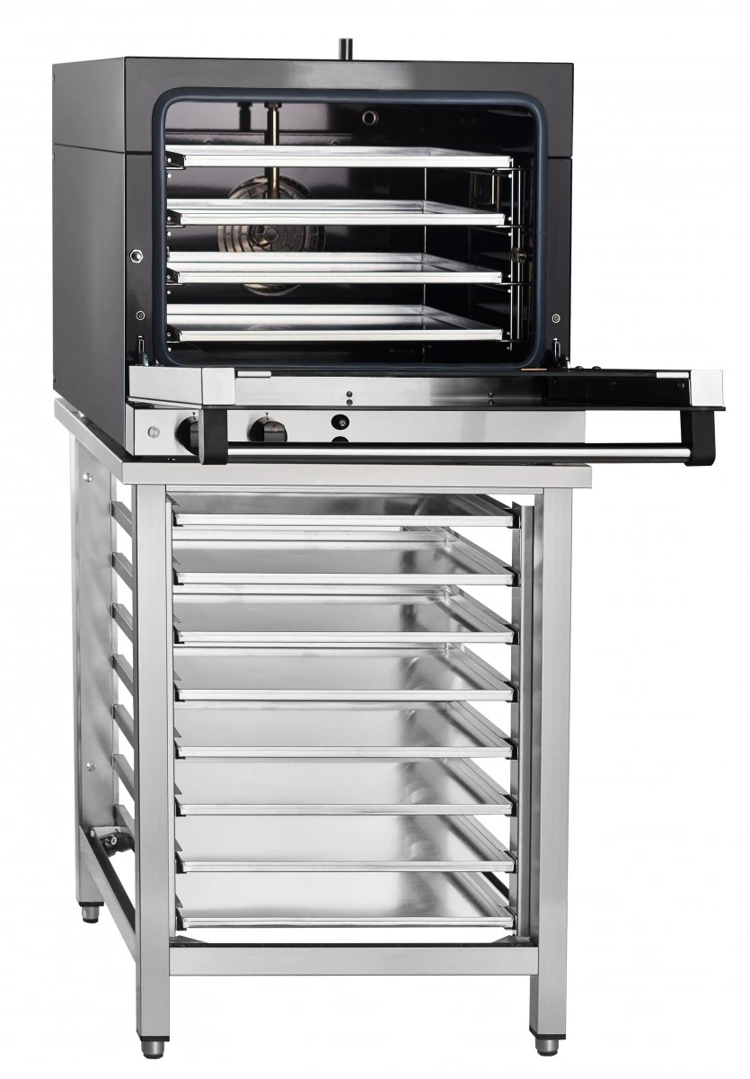 Габаритные размеры: 625х765х514мм, напряжение 220В, эл. мощность 3500Вт, 4 уровня, размер противня 460х330 мм, эмалир. камера, эмалир. корпус, панель управления: эл/механика, пароувлажнение, реверс, без противней