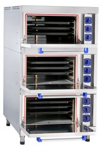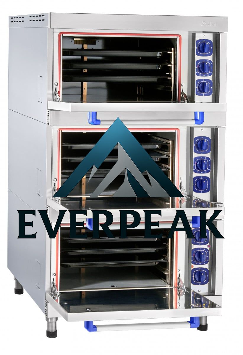 Каждая духовка покрыта высококачественной эмалью и укомплектована 3-мя эмалированными противнями размером 530x470x30 мм. Раздельная регулировка мощности верхнего и нижнего блоков ТЭН-ов. Рабочий диапазон температуры 20-270°С, установленный аварийный терморегулятор предохраняет шкаф от перегрева свыше 320°С. Регулируемые по высоте ножки.