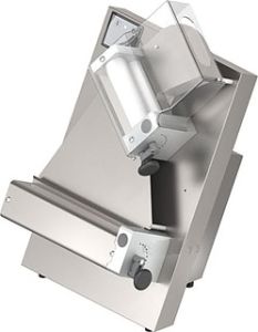 Тестораскатка оснащена 2 верхними и нижними рядами валков из поликарбоната, загрузочным отсеком и серпообразным балансиром. Ее отличительной особенностью является низкое потребление электроэнергии. Поверхность сделана из нержавеющей стали.